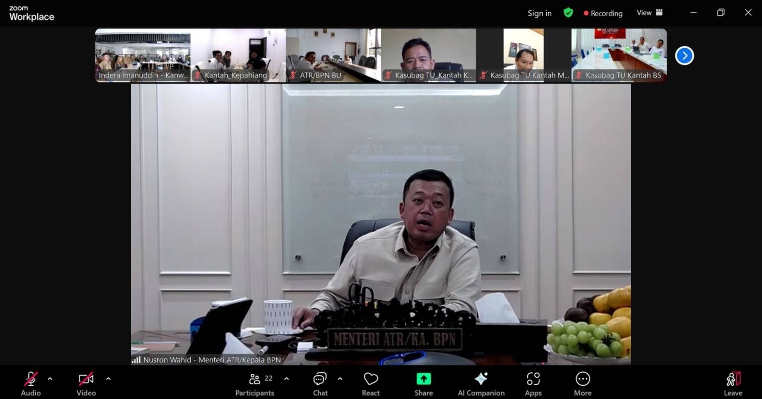 Jakarta – Menteri Agraria dan Tata Ruang/Kepala Badan Pertanahan Nasional (ATR/BPN), Nusron Wahid memberikan pengarahan kepada jajaran Kantor Wilayah (Kanwil) BPN Provinsi Nusa Tenggara Barat (NTB) dan Bengkulu secara daring pada Rabu (11/12/2024).