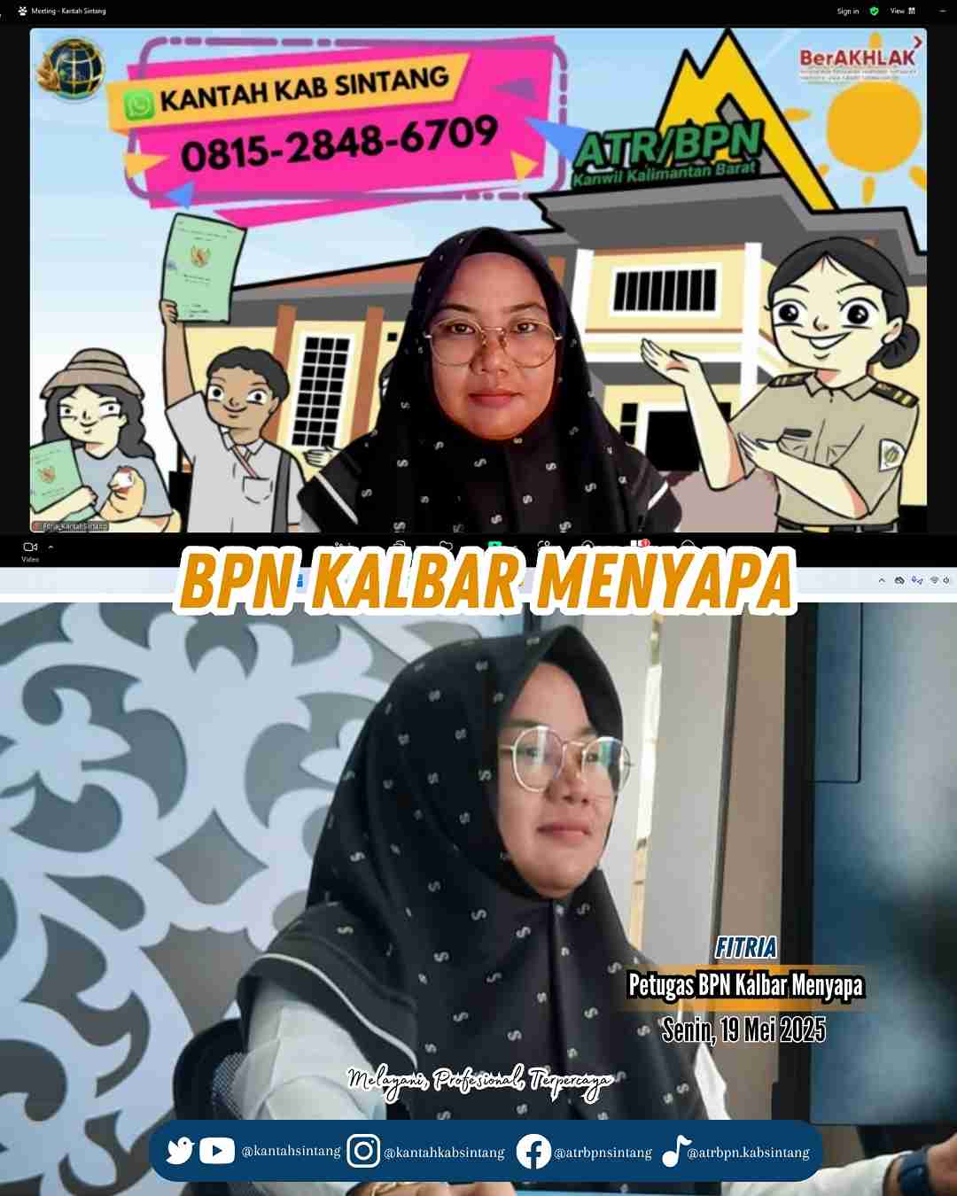 Sintang – Kini Kantor Pertanahan Kabupaten Sintang hadir di BPN Kalbar Menyapa yang dapat diakses melalui tautan bit.ly/BPN-KALBAR-MENYAPA secara daring setiap Hari Senin – Jumat pukul 08.00-10.00 WIB.