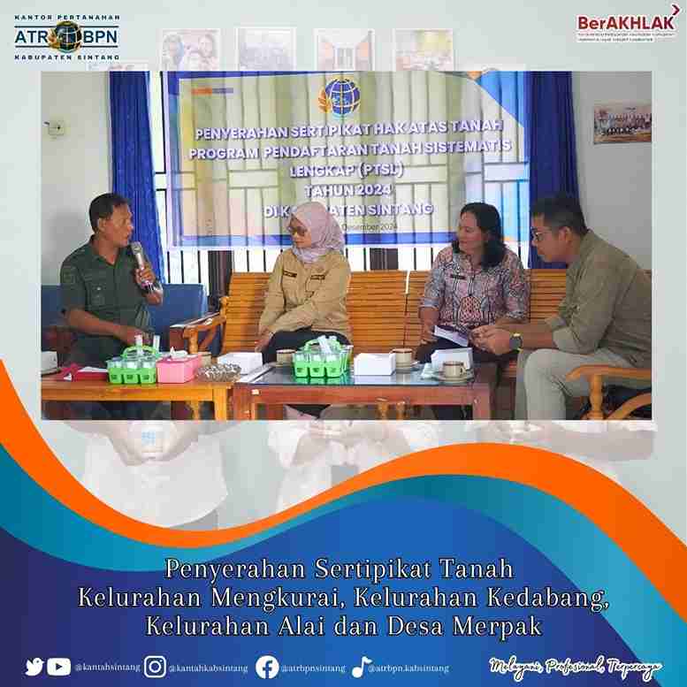 Kepala Kantor Pertanahan Kabupaten Sintang, Catur Widayanti, S.S.T., M.Eng beserta tim satgas fisik dan satgas yuridis PTSL ASN melakukan penyerahan sertipikat tanah Kelurahan Mengkurai, Kelurahan Kedabang, Kelurahan Alai dan Desa Merpak pada Kamis, 19 Desember 2024.